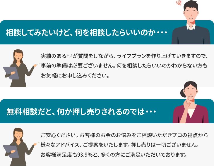 なお、相談は何時間掛かっても無料ですので、お時間を気にせずご納得いただけるまでFPへご質問ください。