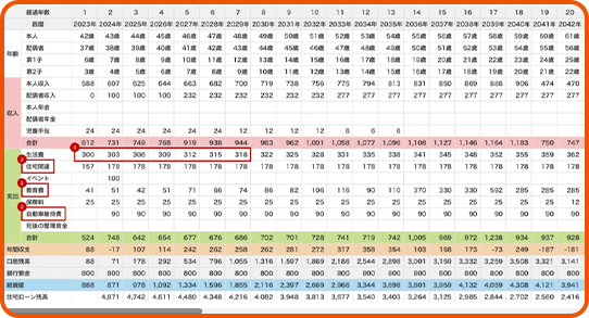 生活費などのベーシックなものからお子さまの教育費など、考えていらっしゃる人生プランに合わせた収支の予定を表にしていきます。これを埋めていくことで現状の収支状況も把握していきます。