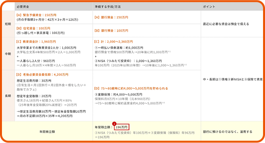 こちらの表を元に、教育費や将来の老後資金など、必要資金の差分を埋めるための手段を一緒に考えていきます。