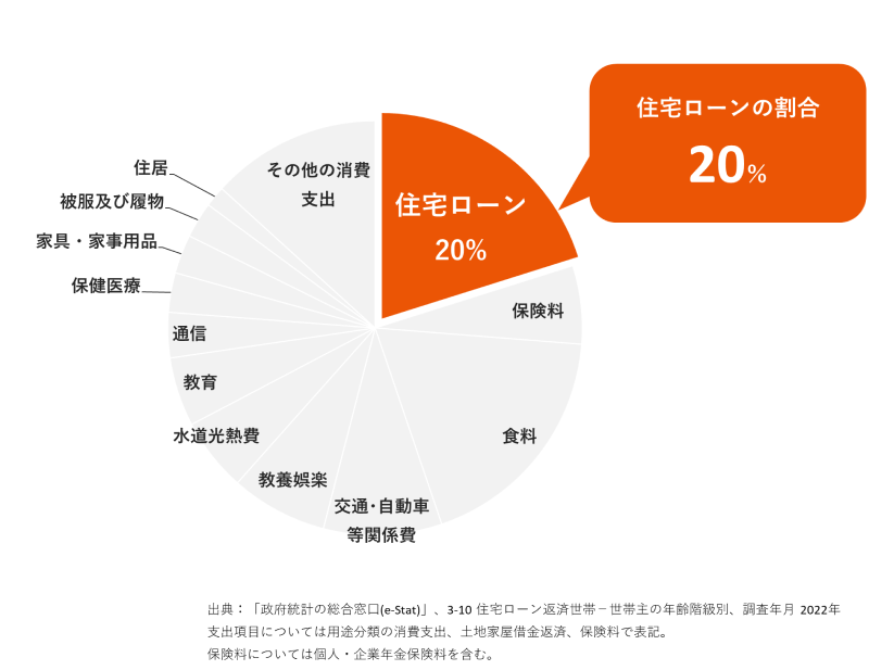 毎月の家計の支出における住宅ローンの占める割合は約20%と最も大きいため、毎月の返済額が減れば、家計の負担を大きく減らすことができます。